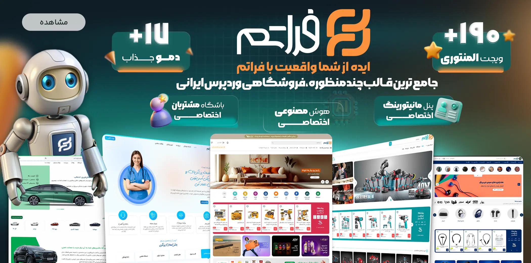فراتم یک قالب چند منظوره برای وردپرس است که برای انواع سایتهای شرکتی، آموزشی و فروشگاهی طراحی شده است. با طراحی مدرن، سرعت بالا و امکانات متنوع، فراتم به شما کمک میکند بدون دانش فنی سایت خود را بسازید. این قالب با سازگاری کامل با افزونههای محبوب و قابلیت سفارشی سازی بالا، انتخابی ایدهآل برای هر نوع کسب و کار است.